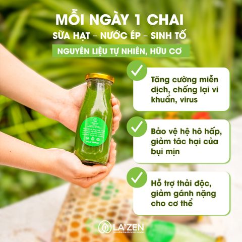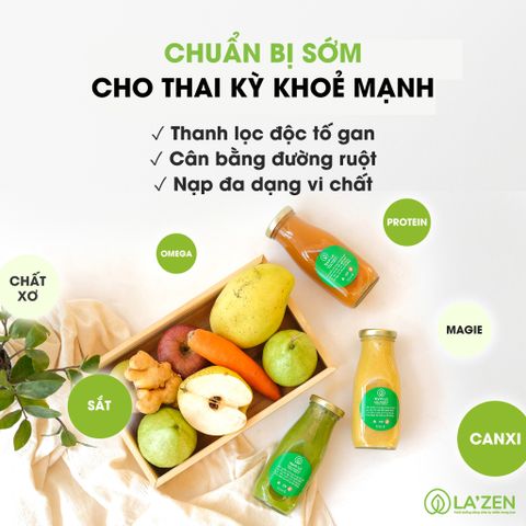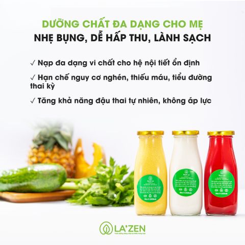 Ý thức được tầm quan trọng của dinh dưỡng lành mạnh trước khi mang thai, La’zen đã thiết kế các thực đơn sữa hạt, nước ép, sinh tố tươi vô cùng đa dạng, phong phú kết hợp từ 13+ loại hạt dinh dưỡng và siêu thực phẩm, 30+ loại rau củ quả được trồng lành sạch theo hướng tự nhiên/hữu cơ, đảm bảo cung cấp cho cơ thể mẹ một môi trường bên trong thuần khiết nhất để trứng phát triển khỏe và tử cung ấm áp sẵn sàng chào đón em bé.