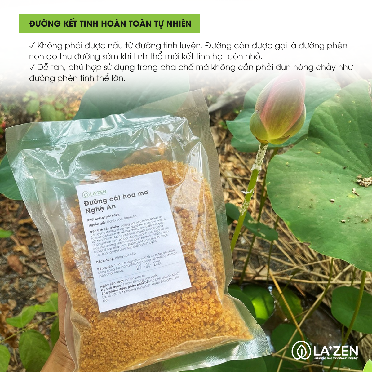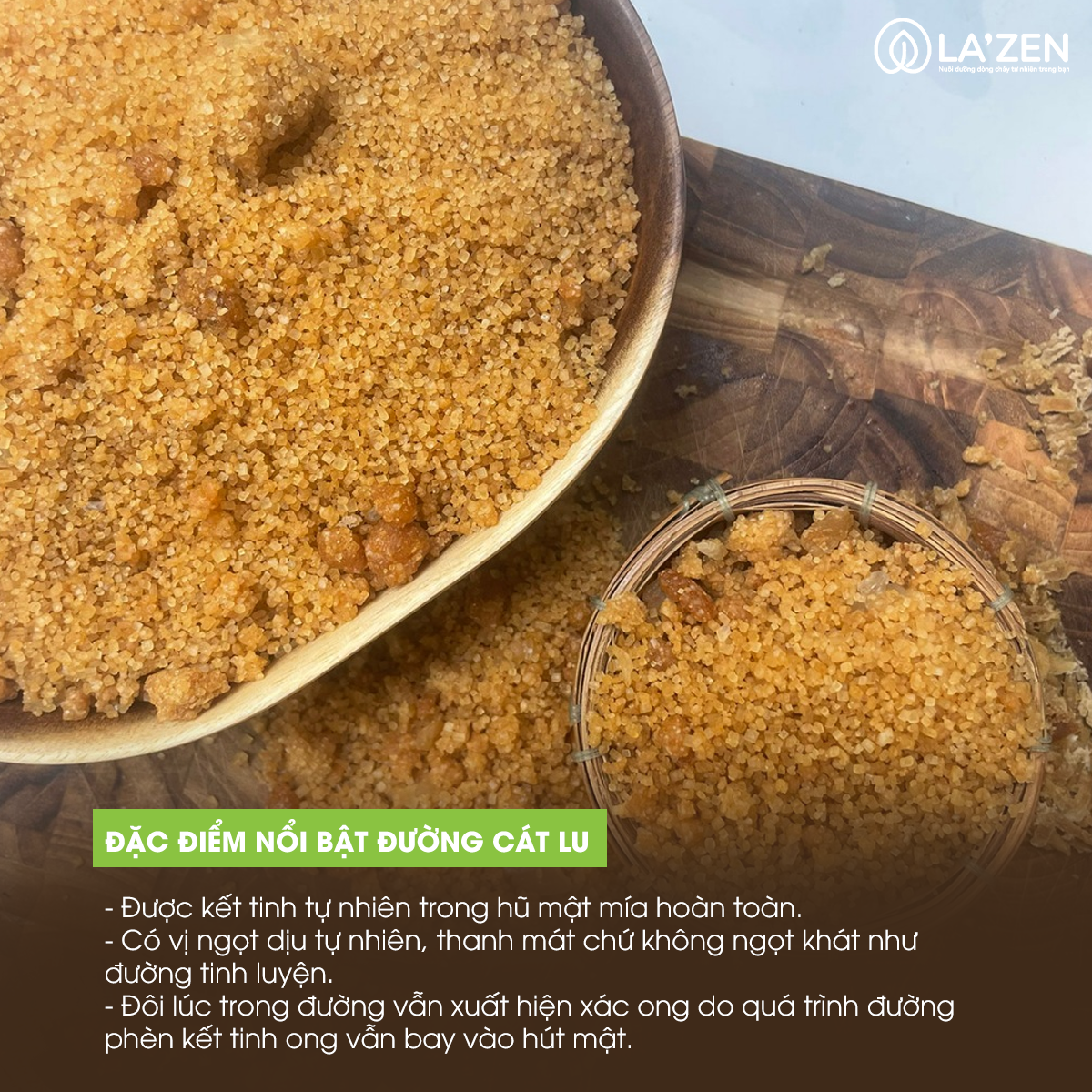 - 100% đường cát lu kết tinh tự nhiên không qua tác động chế biến.