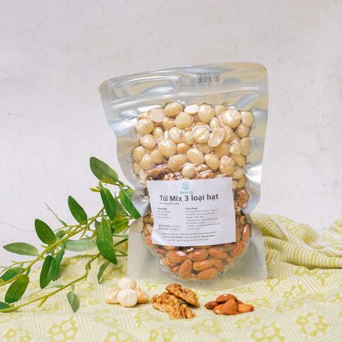 Túi mix 3 loại hạt với nhiều phiên bản khác nhau phù hợp với sở thích, mong muốn của từng khách hàng. Trong 4 loại mix 3 hạt, thì túi mix macca, óc chó, hạnh nhân được yêu thích nhất bởi sự tiện lợi, lại thơm ngon, tiết kiệm chi phí. Túi mix là sự kết hợp của hạt Việt (macca) và hạt nhập khẩu Mỹ (hạnh nhân, óc chó) dành cho Quý khách hàng muốn tìm kiếm một món quà lành mạnh cho sức khỏe hay muốn bổ sung nguồn dinh dưỡng thuần khiết, an lành, tự nhiên từ thực vật.